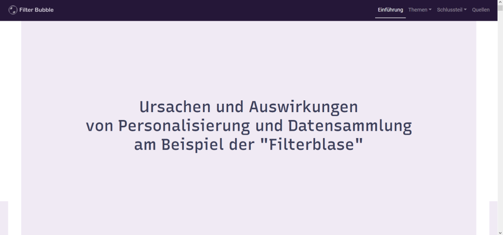 Im Zuge meiner Bachelorarbeit im Bereich der Digitalen Medien (Mediengestaltung) an der Hochschule für Künste habe ich mir den Ursachen und Auswirkungen anhand der Phänomens „Filter Blase“ und dem damit verwandten Phänomen „Echokammer“ beschäftigt. Zu diesem Zweck erstellte ich eine Website, auf der ich die Ergebnisse meiner Recherche einband und vorstellte.